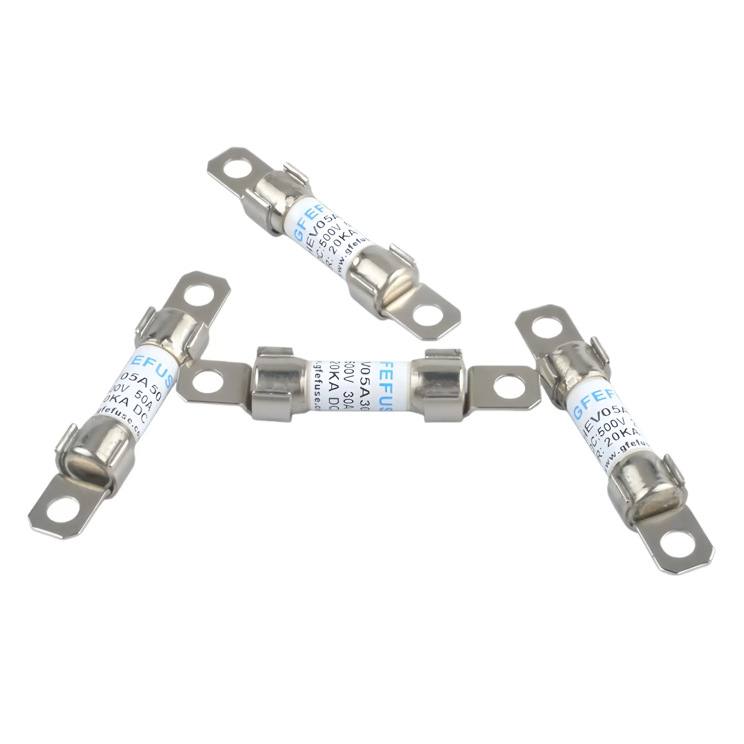 This series of DC fuses are suitable for rated DC voltage of 500V (450V), rated breaking: 20KA, as a comprehensive protection for electric compressors, DC converters and auxiliary circuits, inverters, DC power supplies, instruments and base stations in vehicle-mounted line systems. They also have the characteristics of strong current limiting capability, high breaking capacity, fast short-circuit breaking speed, and can withstand temperature shock, mechanical vibration shock, current shock, chemical load, etc. This series of products complies with the provisions of ISO 8820 and JASO D622 and GB/T31465.